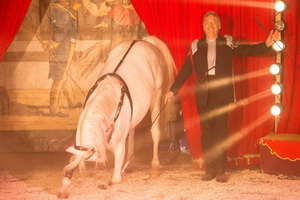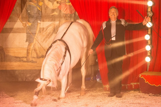 Wenig später präsentiert Gabi Donnert eine exzellente Freiheitsdressur mit zwei Araberhengsten. Souverän führt der erfahrene Dresseur die Chambrière und präzise folgen die Pferde den Anweisungen. Zahlreiche Steiger sind die Highlights in diesem formidablen Auftritt.