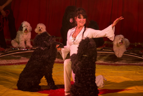Zu Beginn des zweiten Teils präsentiert Gina Giovannis ihre sieben Hunde in einem temperamentvollen und trickreichen Ablauf. Eifrig sind die vierbeinigen Artisten dabei, die genretypischen Abläufe in flotter Folge auszuführen. Variantenreiche Sprünge bilden die Basis, Spanischer Tritt parallel mit der Vorführerin, Hochsitzer und Rollover sind weitere Elemente der Darbietung. Abschließend tollen alle Hunde auf einer Rutschbahn.