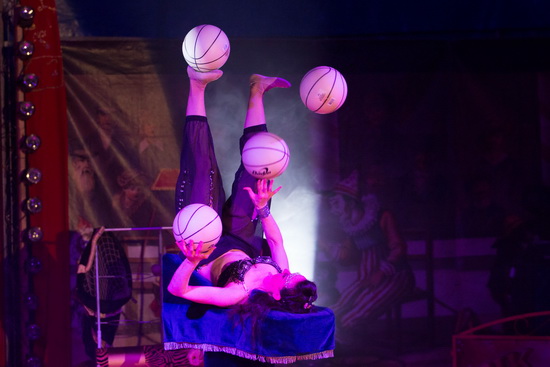 Ewa Varadi ist zudem mit Antipodenspielen zu erleben. Routiniert lässt die charmante Artistin zunächst vier Hula Hoop Ringe um ihre Gliedmaßen kreisen. Die folgenden Touren werden mit bis zu fünf Basketbällen ausgeführt, ehe zwei Rollen zum Einsatz kommen. Ein großes, per LED-Technik leuchtendes Kreuz rotiert zum Höhepunkt des Auftritts auf den Füßen der Künstlerin.