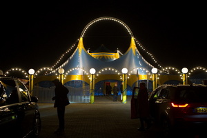 In perfekter Formation ist der große Circus aufgebaut. Die modernen gelb-blauen Zeltanlagen kommen vom Circus Maximum der Familie Zinnecker. Hier wurde das größte der derzeit Chapiteau des Unternehmens, ein hoher Viermaster mit runder spitzer Kuppel, eingesetzt. Ein rechteckiges Vorzelt, dessen beide Masten mit einem hohen Lichterbogen verbunden sind und ein Zweimaster, speziell für einige Dinner-Spektakel Angebote im Rahmen des Gastspiels, komplettieren die Zeltanlagen. Lichterbögen an der eleganten Front und Lichterketten an den Zelten lassen den Circus in der Dunkelheit hell erstrahlen.