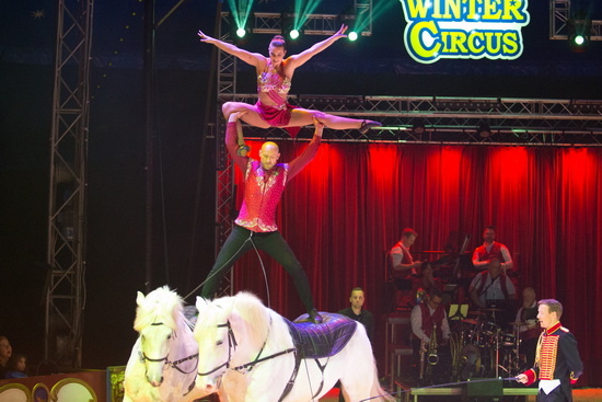 Das Duo Donnert, Adrian und Neyenne, ist mit einem formidablen Pas de Deux zu erleben. Auf einem prächtigen Schimmel-Gespann erfolgen die anspruchsvollen Tricks in flotter Abfolge und ein freier Stand auf dem Kopf des Untermanns markiert den Höhepunkt des Auftritts.