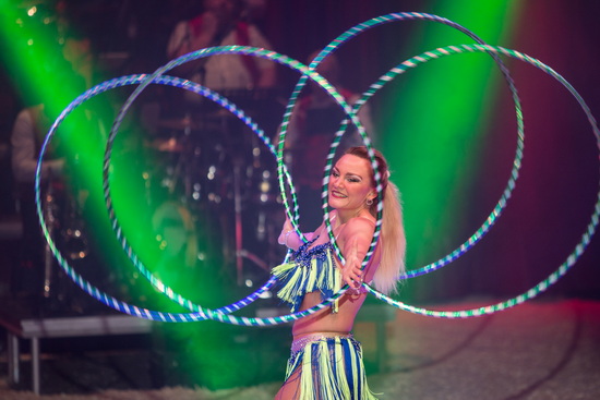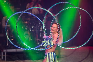 Temperamentvoll präsentiert Chiara Boldini ihr Können mit den Hula Hoop Reifen. In vielen Varianten manipuliert sie die Ringe und schließlich rotieren mehr als zwanzig Reifen zur gleichen Zeit um ihren Körper.