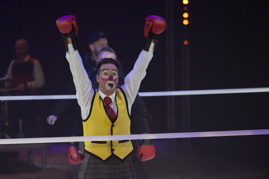 Einen Minihund in einem Elefantenkostüm erleben wir wenig später. Zu guter Letzt organisiert er mit sechs Mitspielern einen großen Boxkampf, den der Clown trotz aller Bemühungen durch ko verliert.