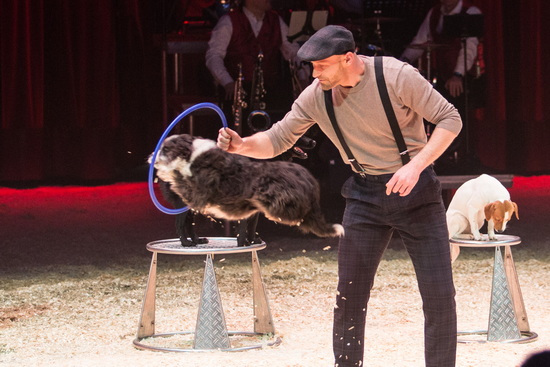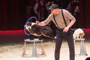Im weiteren Verlauf des Programms präsentiert Adrian Donnert eine Hunde-Revue. Fünf quirlige Vierbeiner bieten eine Reihe temporeich ausgeführter Sprünge.