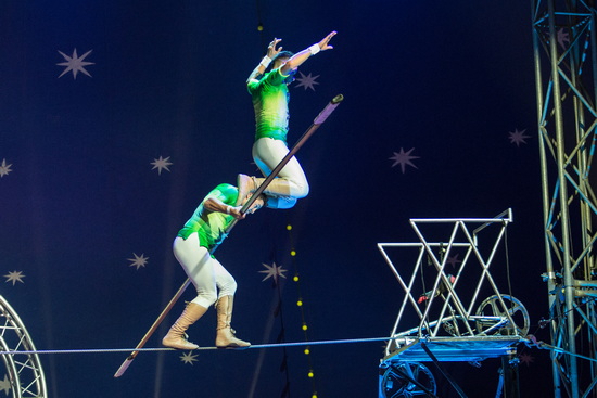 Den abschließenden Höhepunkt des Programms zeigen die beiden vielseitigen Artisten auf dem Hochseil. Nach dem Aufstieg über ein Schrägseil sehen wir eine umfangreiche Abfolge spektakulärer Tricks unter Verzicht jeglicher Absicherungen. Seil springen, Sprung über den Partner, Scheinsturz, Blindlauf, Rolle rückwärts sind einige Elemente des erstklassigen Auftritts. Die Fahrt auf einem BMX-Rad und der freie Stand auf einem Stuhl, eine spezielle Konstruktion deren Beinpaare V-förmig geformt sind, werden ausgezeichnet dargeboten. Höhepunkt des Auftritts ist ein Zwei-Mann-Hoch mit Absprung auf das Seil.
