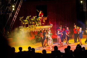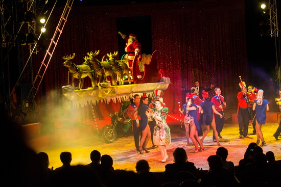 In einer groß angelegten Eröffnungsszene sehen wir zunächst Clown Gino Salvini sich zu Bett begeben. Kaum ist er „eingeschlafen“ beginnt sein Traum vom Circus und das Artisten-Ensembles formiert sich als Ballett in der Manege. Die Kostüme der Damen zeigen Muster der US-amerikanischen Flagge und die Uniformen der Herren nehmen dazu Bezug. Erneut öffnet sich der Vorhang und der Weihnachtsmann rauscht mit seinem, auf einem Trike montierten, Rentierschlitten herein. Dieses wird von der Filmfigur „Grinch“, einem grünhäutigen Weihnachtshasser gefahren. Auf einer großer Plattform über dem Fahrzeug thront der riesige Schlitten, „gezogen“ von vier Rentieren, mit dem Weihnachtsmann darin. André Riedesel ist der versierte Moderator der Show und begrüßt nun das zahlreich erschienene Publikum.