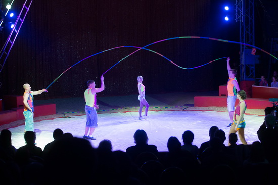 Drei Auftritte bietet die Truppe Sevriukov im Verlauf der Show. Zunächst springen die sechs ArtistenInnen Seil. In bekannter Weise wird in immer wieder neuen Formationen der Weg über die bunten Leinen genommen.