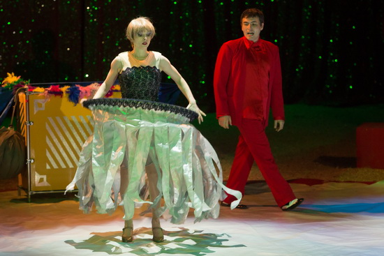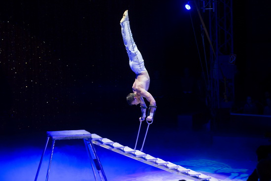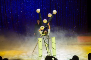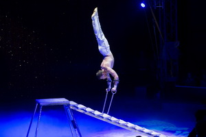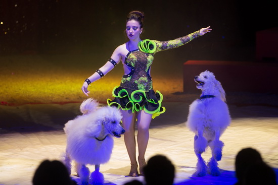 Laura Urunov lenkt eine rasant umherwirbelnden Hundemeute zu ihren Tricks. Pudel der verschiedensten Größen und Barsoi sind in ihrem unbändigen Spieltrieb eifrig dabei, ihr Können zu zeigen. Diese ganz klassisch im Stil des russischen Circus gestaltete Nummer ist von Präzision und hohem Tempo gepaart mit Trickreichtum geprägt.