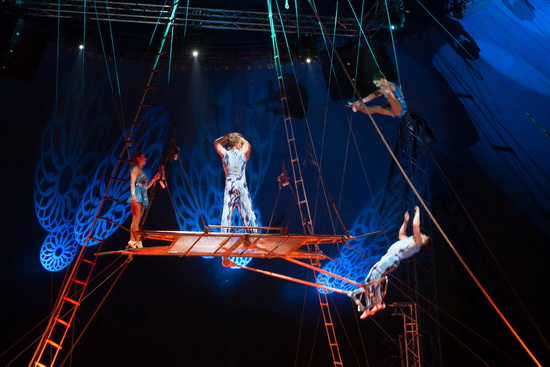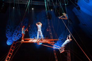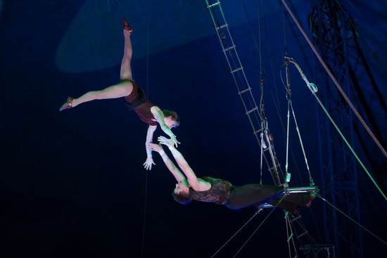 Zum Finale erleben wir noch einmal die komplette Truppe mit einer Luftdarbietung. Unter der Kuppel wird ein mehrere Quadratmeter große Plattform verankert, an deren Unterseite ein Trapez mit Fänger zu beiden Seiten schwingt. Von der Plattform aus starten die Fliegerinnen longengesichert zu ihren Handvoltigen zum Trapez und zurück zu den oben stehenden Fängern.