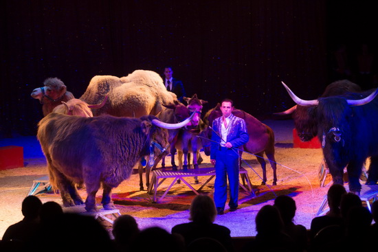 Einen großen Exotenzug bringt Andy Ortmann in die Manege. Zunächst laufen zwei Zebras ihre Figuren. Ihnen folgen vier Kamele, die variantenreiche Abläufe bieten. Vier Esel eröffnen mit ihrem Part ein großes Karussell. Bald gesellen sich vier Rinder hinzu und die Gruppe wird von den Kamelen umrundet. Schließlich liegen die Trampeltiere ab und dienen einigen Lamas als Barrieren für deren Sprünge.