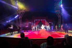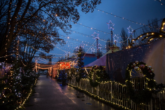 Der Außenbereich des Circus bietet einen immensen Schauwert und verwandelt sich in der Dunkelheit in ein Lichtermeer. Lichtnetze sind über die Zuwegung gespannt und unzählige Lichterschnüre hängen von den Wagen herab. Tannengrün und Kränze funkeln am dekorativen Zaun und geben einer Kunstschneelandschaft Kontur. Auf den Masten der drei aufgebauten Chapiteaux leuchten große Sterne und Lichterketten zieren die Abseglungen und gleich neben dem Eingang hat eine große Krippe ihren Platz.