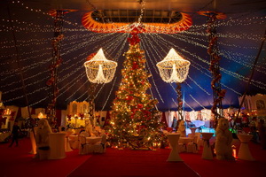 Im Zentrum des Restaurationszeltes steht ein grandios geschmückter, riesiger Weihnachtsbaum, der bis hoch in die Kuppel reicht. Von seiner Spitze spannen sich Lichterketten zu jeder Rondellstange. Zahllose Dekoelemente schmücken den mit rotem Teppich ausgelegten Raum. Rund um den Baum und in schmiedeeisernen Gartenlauben zwischen den zahlreichen Verkaufsständen sind mit weißen Hussen bezogene Sitzgruppen und Stehtische angeordnet.