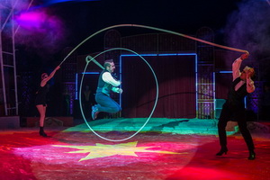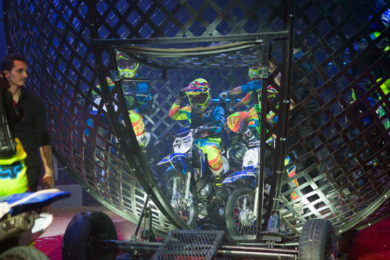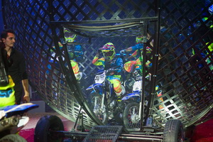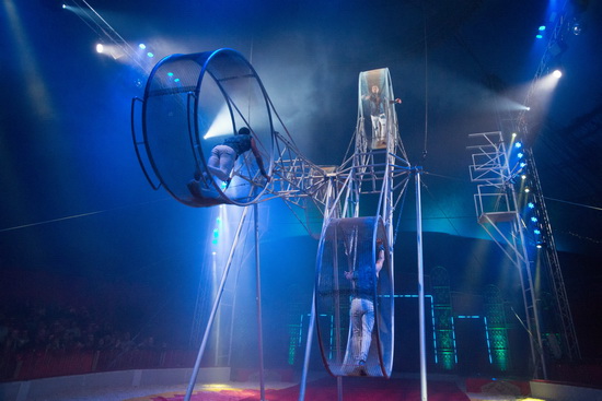 Vor der Pause sehen wir die Truppe wieder – nun mit verwegener Motorradartistik im „Globe of Death“. Bis zu fünf Fahrer sind in der Stahlgitterkugel zu gleicher Zeit unterwegs. Besonders effektvoll sind die abschließenden Touren, wenn die per LED beleuchteten Maschinen Lichtspuren ins abgedunkelten Zelt zeichnen.