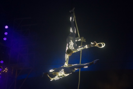 Das Duo „Light for Life“ fasziniert mit einem außergewöhnlichen Act am Vertikalseil. Die Publikumswirksamkeit der vielseitigen und anspruchsvollen Partnertricks wird durch die besondere Präsentation nochmals gesteigert. Das Duo arbeitet im abgedunkelten Zelt, in weißen Kostümen, die durch zahlreiche eingearbeitete LED-Schnüre hell leuchten. Das Lichtdesign passt sich perfekt an die Abläufe an, Körperpartien werden intensiver oder schwächer illuminiert, strahlen hell oder sind völlig dunkel in Abhängigkeit von den Aktionen in der Kuppel.
