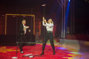 Zwei mitreißende Nummern arbeitet die Familie Oscar Togni. Zunächst erleben wir den Junior zusammen mit seiner Mutter und seiner etwa sechzehnjährige Schwester mit Lassospielen. Virtuos erfolgen die zahlreichen und enorm variantenreichen Tricks, darunter viele Abläufe die man andernorts nicht sieht. In vielfältiger Weise erfolgen Sprünge durch die Seilschlingen. Zudem werden die rotierenden Lassos von einem zum anderen Akteur übergeben. Im zweiten Programmteil präsentiert Oscar Togni, als leicht trotteliger Butler, mit seiner Frau eine fulminante Tellerjonglage. Rasch rotieren auf den Stäben eines zentral in der Manege stehenden Gestells sicher und ruhig fünf Teller, während die Bemühungen auf zwei vorn stehenden Gestellen je drei Teller laufen zu lassen, permanent hektischer und scheinbar unkoordinierter werden. Absichtlich gehen zahlreiche Teller zu Bruch, werden so knapp beschleunigt, das sie nach wenigen Umdrehungen rasch hinabfallen und auf Metallstangen, die am Boden liegen, zerschellen. Andere werden, beim Versuch sie aufzufangen, am Requisit zerschlagen. Das Publikum nimmt am turbulenten Geschehen lebhaften Anteil, geht begeistert mit und fiebert dem glücklichen Gelingen des Vorhabens entgegen.