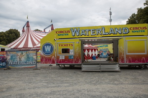 Auf dem Circusplatz in Gummersbach waren die rot-weiß gestreiften Zeltanlagen aufgebaut. Das Vier-Masten Chapiteau findet Ergänzung in einem optisch passenden Vorzelt und einem Garderobenzelt. Ein kombinierter Kassen- und Durchgangswagen mit aufklappbarer Fassade bildet die Front des Unternehmens. Große hohe Zaunelemente, die auf Spannbändern das Plakatmotiv des Circus zeigen, flankieren den Frontwagen. Die Transportfahrzeuge sind ringsum abgestellt. Die Wagen sind in einem hellen Gelbton gehalten und mit dem Circusnamen – in roten und blauen Lettern – beschriftet.