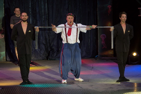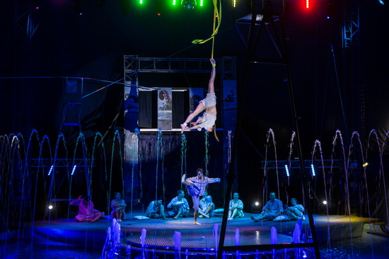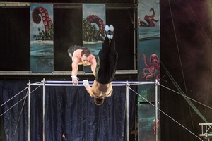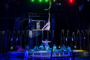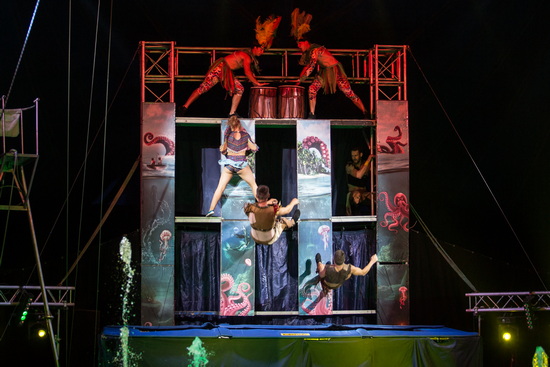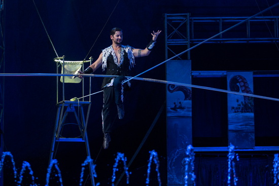 Gleich darauf sehen wir ein Paar auf einem relativ flach über dem Bassin gespannten Hochseil. In dem kurzen Auftritt zeigt die Artistin, die sich permanent mit einer Hand an ihrer Longe festhält, einen Spagat. Ihr Partner sitzt auf dem Seil ab, zeigt eine weitere Balancepose und überquert das Seil mit verbundenen Augen.