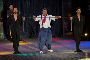 Zwei Herren arbeiten eine kurze Kür am Reck – dann folgt eine der stärksten Darbietungen der Show. Der harmonische Auftritt eines Duos an den Strapaten findet in der besuchten Vorstellung allerdings ein jähes Ende. Der männliche Part sackt nach einem Trick auf der Bühne kurz ohne Bewusstsein zusammen und musste hinaus geführt werden.