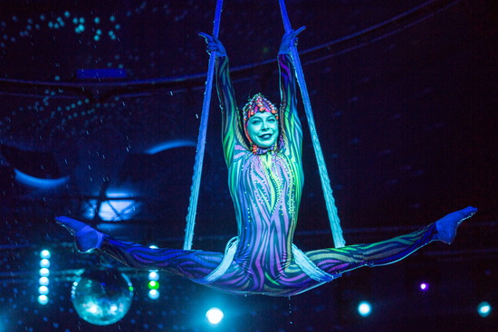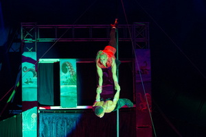 Mit Beginn der Show wird es allmählich Tag über der Bühne und die Gruppe der Artisten, in Pyjamas und mit einem Kopfkissen ausgestattet, erwacht aus dem Schlaf und eine junge Frau zeigt ihr Können an den Strapaten.