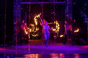 Die anschließende Feuershow wird von vielen Akteuren im Wasser und auf der Bühne bestritten. Twirlings und brennende Bälle wirbeln und Fackeln lodern hell.