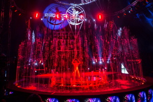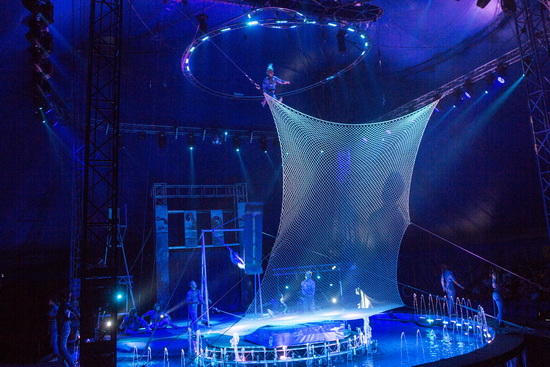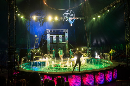 Ein neunreihiges Gradin, dessen beiden untersten Reihen mit Schalensitzen ausgerüstet sind, steht den Besuchern im Spielzelt zur Verfügung. Auf Logen wird verzichtet, so dass ein breiter Gang zwischen Gradin und Wassermanege entsteht. Die hohe Außenseite des Bassin ist ringsum mit Videopaneelen besetzt, auf die während der Show abwechslungsreiche Bilder projiziert werden. Die mittig im Bassin platzierte Insel ist mit einer größeren Bühnenfläche ergänzt, die das hintere Viertel des Bassins überdeckt.