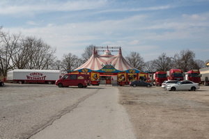 Die große, lebhaft mit Circusmotiven bemalte Fassade erstrahlt im Farbwechsel ihrer neuen LED-Beleuchtung und lädt zum Besuch des Circus ein. Da dem Circus nur ein Teil des Festplatzes zur Verfügung stand drängen sich die zahlreichen Fahrzeuge dicht aneinander gereiht rings um das Zelt. Der komplette Fuhrpark, er besteht zum allergrößten Teil aus gepflegten Tonnendachwagen, glänzt in frischem Lack. Strahlendes weiß und ein elegantes rot bestimmen das vorzügliche Erscheinungsbild der Fahrzeuge.