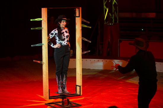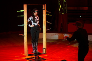 Dominik Weisheit ist zusammen mit seiner Partnerin Anja mit einer Western Darbietung zu erleben. Präzise und mit sehr viel Schwung platziert er die Messer sehr dicht rings um den Körper der Partnerin. Verschiedene Tricks mit dem Lasso lockern die Abfolge der Messerwürfe auf. Schließlich steht die Partnerin in einem sich permanent um ihren Körper drehenden Rahmen während die Messer zielsicher die nur ca. zwanzig Zentimeter breiten Planken treffen.