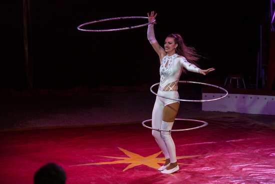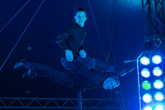 Eine attraktive Luft-Darbietung sieht Mary-Ann Weisheit in Aktion. Mit einigen ruhig vorgetragenen Handstandfiguren in der Manege beginnt die junge Frau ihre Evolutionen. Sodann wechseln Licht-Stimmung und Tempo der Musik und die Artistin erobert in weiten Flügen die Kuppel. In vollem Schwung bietet sie ein umfangreiches Repertoire der Tricks des Genres am Luftring.