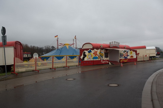 Am Rand eines lebhaften Gewerbegebietes war der Circus auf einer großen Wiese aufgebaut. Auf dem leicht abschüssigen und auf Grund des Wetters der vergangenen Tage aufgeweichten Gelände waren nur das blau-gelbe Vier-Masten-Chapiteau sowie der Stall und die Raubtieranlage von Sascha Prehn platziert. Der große, mit bunten Circusmotiven bemalte, Fassadenwagen hatte seinen Platz direkt an der Straße; flankiert von dekorativen Stakettzaun-Elementen. Die Materialtransporte waren am Straßenrand abgestellt und die Wohnwagen fanden etwa 200 Meter entfernt, auf einem ebenen Gelände an einem befestigten Weg ihren Standort.