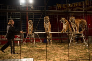 Sascha Prehn präsentiert seine vier Tiger in trickstarkem Ablauf. Die mächtigen Raubkatzen zeigen geschmeidig ihr umfangreiches Können, das souverän abgerufen wird. Verschiedene Sprünge – durch einen Handreifen, über den Dompteur, über andere Tiere – bilden das Rückgrat der Darbietung, die darüber hinaus, Hochsitzer, Pyramide, Rollover und einiges mehr bietet. Ein fulminanter Hinterbeinläufer und Futteraufnahme direkt aus der Hand runden den Auftritt in gelungener Weise ab.