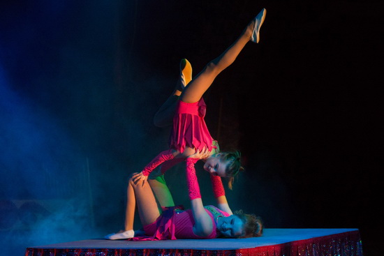 Mary-Ann und Josefine präsentieren ihre Kautschuk- und Parterreakrobatik-Tricks. Die beiden jüngsten Weisheit-Kinder beherrschen ein umfangreiches Repertoire, dass sind gekonnt und selbstständig in spielerischer Manier vortragen.
