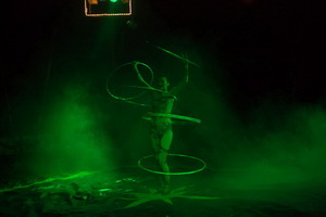 Jasmin Quaiser arbeitet eine temperamentvolle Hula Hoop Darbietung, die viele der genretypischen Abläufe bietet.