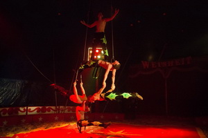Die Gebrüder Weisheit begeistern mit einer erstklassigen Nummer an den Römischen Ringen. Zu fünft beeindrucken sie mit Kreuzhang, Aufschwüngen und Handständen, Klimmzügen an einem Arm und gar nur an zwei Fingern. Ungeheuer kraftvoll und in erstklassiger Ausführung erfolgen eine Reihe attraktiver Partnertricks. Beim Schlusstrick trägt David zusätzlich zu seiner Balance das Gewicht seiner drei erwachsenen Partner und auch das seines jüngsten Bruders, des vierzehnjährigen Jessy.