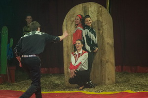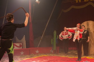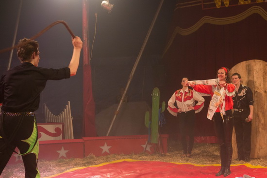 In einem weiteren fulminanten Truppenauftritt erleben wir mit der großen Western-Show einen Klassiker im Programm der Familiencircusse. Kevin und David wechseln sich bei den Tricks mit Lassos ab. Dominik versteht sich exzellent darauf, Zeitungsseiten mit Hilfe einer Bullpeitsche in kleine Schnipsel zu zerlegen. Auch die Trinkhalme, die die Partnerin im Mund hält, werden mit der Peitsche sicher zerteilt. David ist der „Herr der Messer“, der mit seinen gezielten und sicher ausgeführten Würfen die Konturen der Partnerinnen auf dem Brett nachzeichnet.