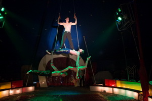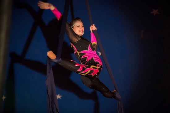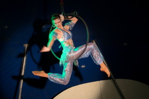 Anmutig präsentiert Jaqueline Quaiser zwei sehr gute Luftnummern. Zunächst agiert sie in gekonnter Weise an den Strapatentüchern. Kraftvolle Passagen wechseln mit schwungvollen Flügen und spektakulären Abfallern. Am Ringtrapez werden die einzelnen Halteposen mit fließenden Übergängen elegant verbunden und ungesichert ausgeführte Balancen verleihen dem Auftritt den nötigen Nervenkitzel.