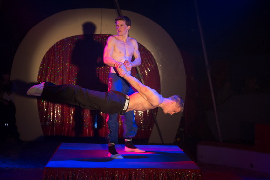 Die Brüder Kevin und David zeigen exzellente Handstandequilibristik, wie man sie in dieser Qualität nur selten in Familienunternehmen sieht.. Abwechselnd arbeiten sie ihre verschiedenen Handstände und Waagen und gewinnen auf der Stuhlpyramide permanent an Höhe. Sodann folgen Hand-auf-Hand Sequenzen. Sicher und gekonnt wird eine umfangreiche Anzahl hochkarätiger Tricks ausgeführt.