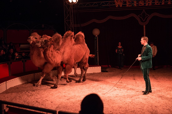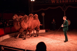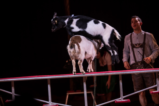 Drei hauseigene Darbietungen mit Tieren bringt Chefdresseur Dominik Weisheit in die Manege. Zunächst zeigen zwei niedliche Hunde ihr erlerntes Können und wenig später leiten die Damen des orientalischen Balletts die Kameldressur ein. Ihr Manegendebut haben drei junge Ziegen. Sie beherrschen Balken- und Flaschenlauf und zeigen sich als geschickte Springer.