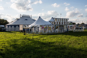 Auf einer weitläufigen Grünfläche neben der örtlichen Sporthalle präsentierte sich der Circus in der abendlichen Herbstsonne in Bestform. Die Pandemie bedingt erzwungenen Tourneepausen in den beiden vergangenen Jahren wurden genutzt, das Erscheinungsbild des Circus nochmals aufzuwerten und dem teils historischen Material zu einem frischen Look zu verhelfen.
