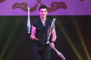 Tempojongleur Joshua Ukmar arbeitet vielseitige Routinen mit den verschiedenen Requisiten. Zuerst lässt er versiert einen Tennisschläger auf den Devil Sticks tanzen. Es folgen Touren mit bis zu sieben weißen Ringen. Die variantenreichen Routinen mit Keulen, sie bilden den Schwerpunkt des Auftritts, werden sicher und souverän vorgetragen.