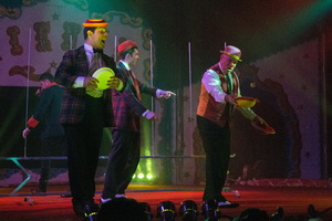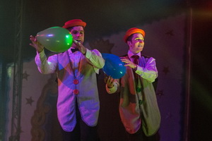 Die Auguste Leonel Chaves und Leonardo de Vos verbreiten mit ihren gekonnt gespielten Reprisen Heiterkeit. In dieser Spielzeit lassen sie vier Herren auf vier Stühlen Platz nehmen, und balancieren eine Flasche auf einem Besenstiel. „Musizieren verboten“ heißt es einmal mehr und ein weiteres Musikabspielgerät landet in der Tonne.... Zudem spielt Leonardo de Vos den „Circus Renz Marsch“ live auf dem Xylophon. In der Clownsformation „Los Claudios“ sind die beiden gleichfalls zu erleben. Heißt es im ersten Entree „ein Teller und ein Ei“, werden wenig später mit zahlreichen Gags etliche Luftballons vorzeitig zerstört, ehe es endlich zum finalen Pistolenschuss auf den empor gehaltenen Ballon kommt. Mit temperamentvollem gemeinsamen musizieren klingt das Entrée harmonisch aus.