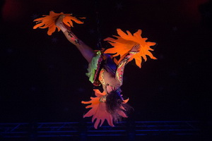 Zwei unterschiedliche Antipoden-Darbietungen präsentiert Tamara Khurchdova über und auf der Bühne des Wiener Circus. Zunächst sehen wir ihren bestens bekannten Act bei dem sie kleine, leuchtend orange bzw. grüne Teppiche temporeich über Hände und Füße wandern lässt. Mehrfach lässt sich die Artistin, völlig ungesichert – rücklings in einem Hüftgurt hängend, bzw. mit einem Fuß in einer offenen Schlaufe – während der Jonglage hoch in die Kuppel ziehen. Im zweiten Teil der Show sehen wir ihre neue, romantisch gestaltete Darbietung. Zwei große hinterleuchtete Schirme, die auf eine Achse montiert sind, werden virtuos manipuliert. Auf einem flachen Tisch, ohne Rückenkissen oder Ähnlichem, liegend lässt die versierte Artistin bis zu fünf große Ringe um ihre Füße kreisen. Den Höhepunkt des Auftritts bildet ein lange gehaltener Kopfstand ohne Vorteil, während die Schirme auf den Füßen rotieren und in einer Hand ein kleiner beleuchteter Schirm ruht und in der anderen aus einem „Buch“ Seifenblasen aufsteigen.