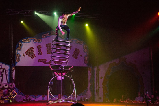 Lowell Ukmar, der jüngere Bruder von Joshua, eröffnet den zweiten Programmteil mit gekonnten Evolutionen auf der Rola Rola. Seil springen und die Balance auf einem Ball sind einige der sehr sicher und gekonnt ausgeführten Figuren. Sechs metallene Bänkchen türmt er Artist unter seinen Füßen auf der Rola zu einem hohen Turm und abschließend bilden sechs Rollen den labilen Untergrund, auf dem die Balance sicher gehalten wird.
