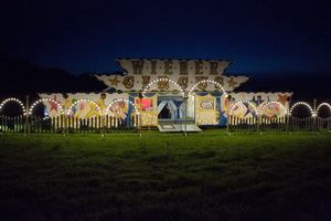 Der große, reich verzierte Artisteneingang nimmt den hinteren Bereich des Zeltes ein.