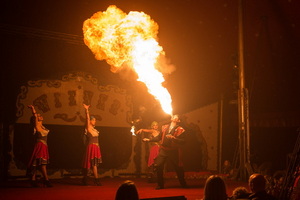 Die Auguste Leonel Chaves und Leonardo de Vos erobern, vom Haupteingang kommend, mit lautem Hallo die Bühne und stören das Trompetenspiel von Lowell Ukmar. Schon bald kommen andere Ensemble-Mitglieder hinzu und lassen, mit mitgebrachten Schuhen und Kleidungsstücken, die beiden Störenfriede zu Clowns werden. Damen in Gipsykostümen mit lodernden Fackeln reihen sich in das Bild und aus dem Opening entwickelt sich Fakir-show des Duo „Gipsy Fantasie“. Abwechslungsreiche Feuerspiele – beide Akteure löschen Fackeln im Mund, halten die Flamme lange auf der Zunge – ziehen die Besucher in ihren Bann. Schließlich lässt der Fakir meterhohe Feuersäulen aus seinem Mund aufsteigen.