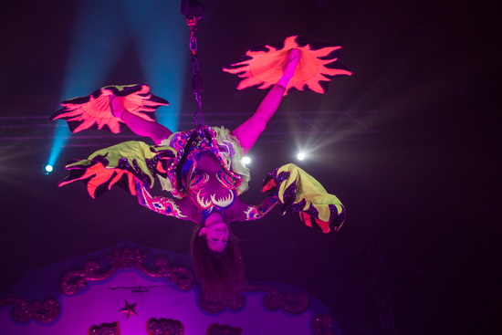 Zwei Darbietungen präsentiert Tamara Khurchdova in dieser Show. Zunächst sehen wir ihren bestens bekannten Antipoden-Act bei dem sie kleine, leuchtend orange bzw. grüne Teppiche temporeich über Hände und Füße wandern lässt. Mehrfach lässt sich die Artistin, völlig ungesichert – rücklings in einem Hüftgurt hängend, bzw. mit einem Fuß in einer offenen Schlaufe – während der Jonglage hoch in die Kuppel ziehen.