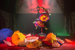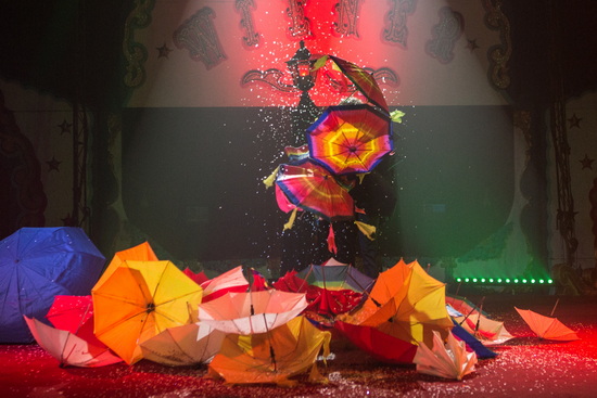 Neu erarbeitet hat sich die vielseitige Artistin, die wir in den unterschiedlichsten Genres erleben durften, einen geheimnisvollen Magic Act. Mystisches Licht und Nebel bilden den geeigneten Rahmen für die Manipulationen. Scheinbar aus dem Nichts erscheinen zahlreiche Schirme unterschiedlichster Größe und „bevölkern“ die Bühne. Immer wieder wandeln sich schlichte weiße und rote Tücher, die die Magierin manipuliert in immer wieder neue Schirme. Mehr als vierzig seien es, lässt sie uns wissen, als schließlich zwei große Sonnenschirme den Höhepunkt des Auftritts bilden.
