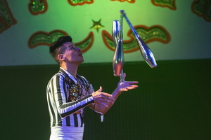 Der mexikanische Jongleur Pablo Martinez sorgt noch einmal für enormen Wirbel in der Show. In sehr hohem Tempo präsentiert er zunächst sein umfangreiches Können mit silbernen Keulen. Es folgen Routinen mit Tischtennisbällen, die aus dem Mund hoch katapuliert und sicher wieder gefangen werden. Temperamentvoll agiert der Jongleur mit Sombreros und bei seiner Runde durchs Publikum wird auch das Baseball Cap eines Besuches in die Jonglage mit einbezogen. Schließlich wird der letzte Sombrero mit einem wilden Hechtsprung knapp über dem Bühnenboden gefangen.