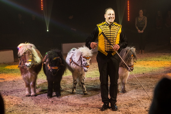 Direktor Roberto Frank präsentiert die erste von zwei Tier-Darbietungen. Vier muntere Shetland-Ponys trippeln munter ihre vielseitigen Lauffiguren in den Manegensand und zeigen beherzte Barrierensprünge. Ein kraftvoller Vorwärtssteiger markiert den Höhepunkt des Auftritts.