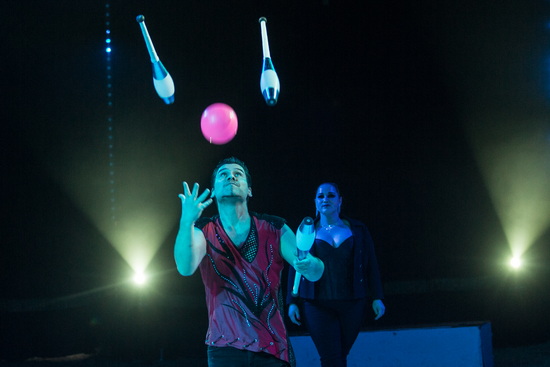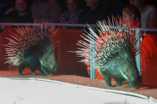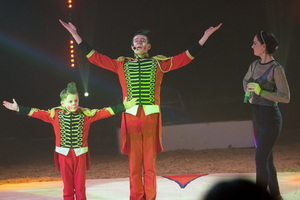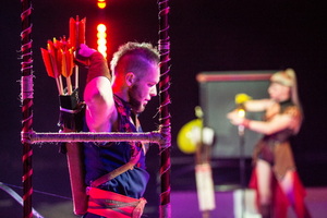 Das aus Lettland stammende Duo Silinevich war im vergangenen Jahr bereits mit dem Circus auf Tournee. Nun sehen wir ihre stylisch choreographierte Kunstschützen-Nummer. Ihre moderne Interpretation nordischer Jäger mit Pfeil und Bogen kommt sehr gut an. Luftballons, die von der Partnerin im Mund und den Händen gehalten werden, werden genauso sicher getroffen wie ein langsam frei hernieder sinkender Ballon und ein platzierter Schuss löscht eine brennende Kerze aus.