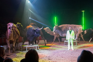 Die Exoten des Circus Hallygally präsentiert Fernando Frank in einem abwechslungsreichen Auftritt. Zunächst sind es drei Stachelschweine die eifrig umher wuseln und den Aufforderungen des Tierlehrers rasch nachkommen. Anschließend flechten drei Dromedare lange, verschiedenfarbige, aus der Kuppel herabhängende Tücher zu einem dicken Zopf. Zudem bieten sie eine umfangreiche Abfolge an Lauffiguren, in die zunächst auch einige Rinder eingebunden sind. Die abschließenden Touren, die normalerweise drei Pinto-Schecken mit den Dromedaren in Aktion sehen, litten darunter, das zu Beginn des Gastspiels zwei Pferden aufgrund von Hufverletzungen pausieren mussten.